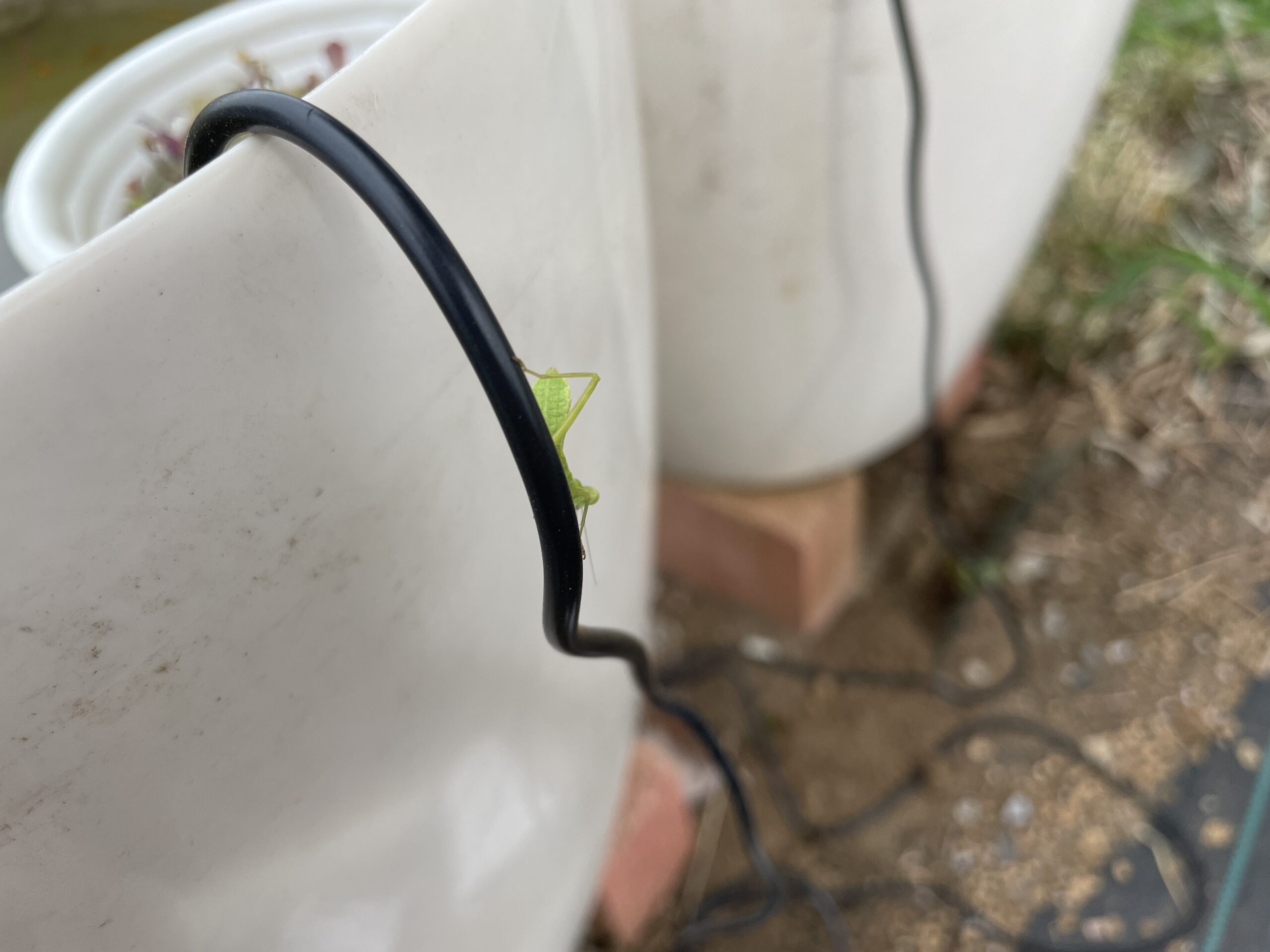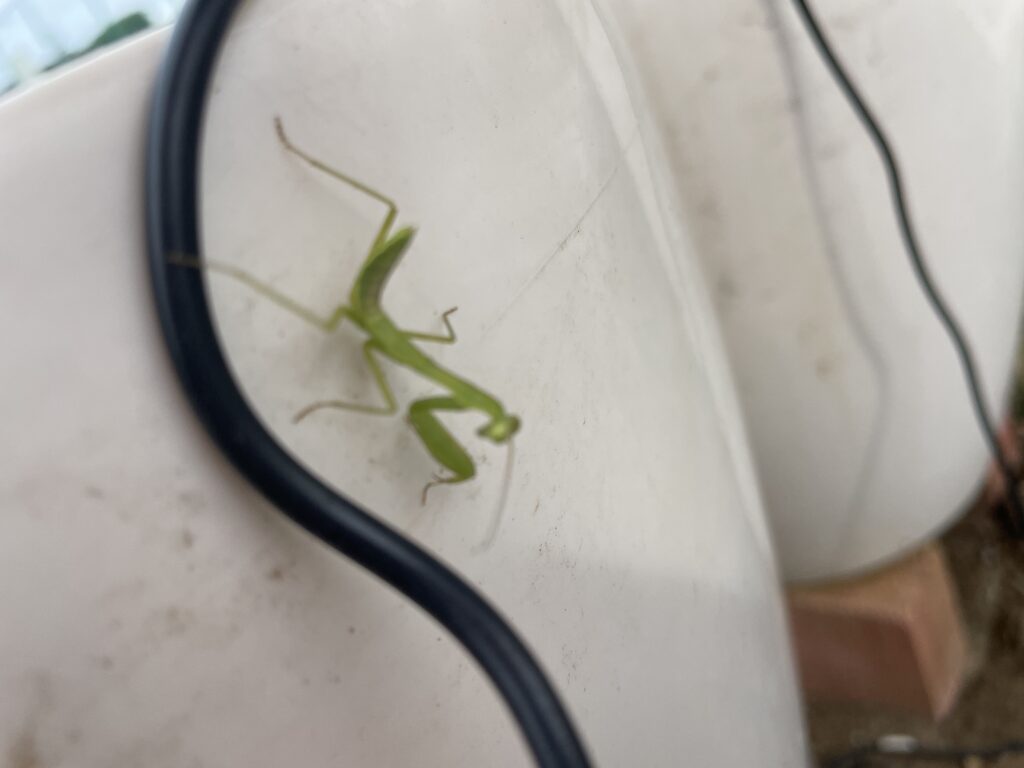 細いコードに身を隠すカマきちさん